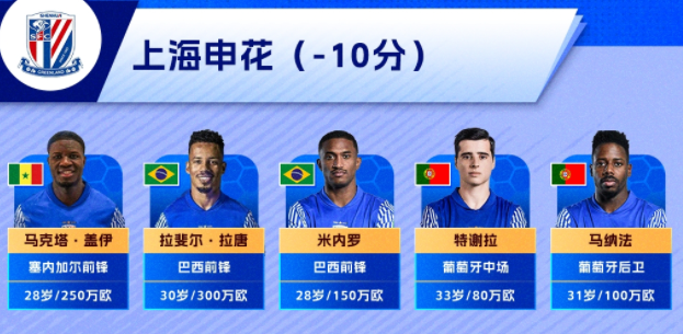 上海申花五外援:盖伊250万欧、拉唐300万欧、米内罗150万欧、马纳法100万欧、特谢拉80万欧,外援总身价880万欧