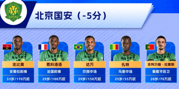 北京国安五外援:三人身价超100万欧,170万欧的法比奥、100万欧的恩科洛洛、150万欧的达万;两人身价低于100万欧,55万欧的孔特、70万欧的拉莫斯,外援总身价545万欧