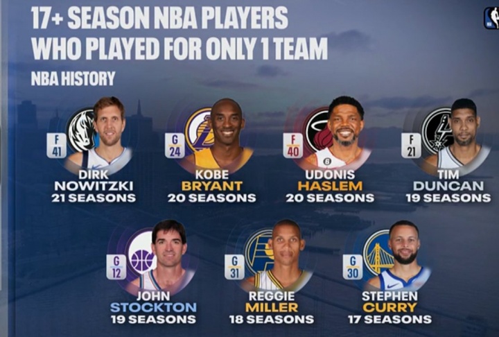 一人一城17+赛季名单:诺维茨基 独行侠 21个赛季科比 湖人 20个赛季哈斯勒姆 热火 20个赛季邓肯 马刺 19个赛季斯托克顿 爵士 19个赛季雷吉·米勒 步行者 18个赛季库里 勇士 17个赛季...